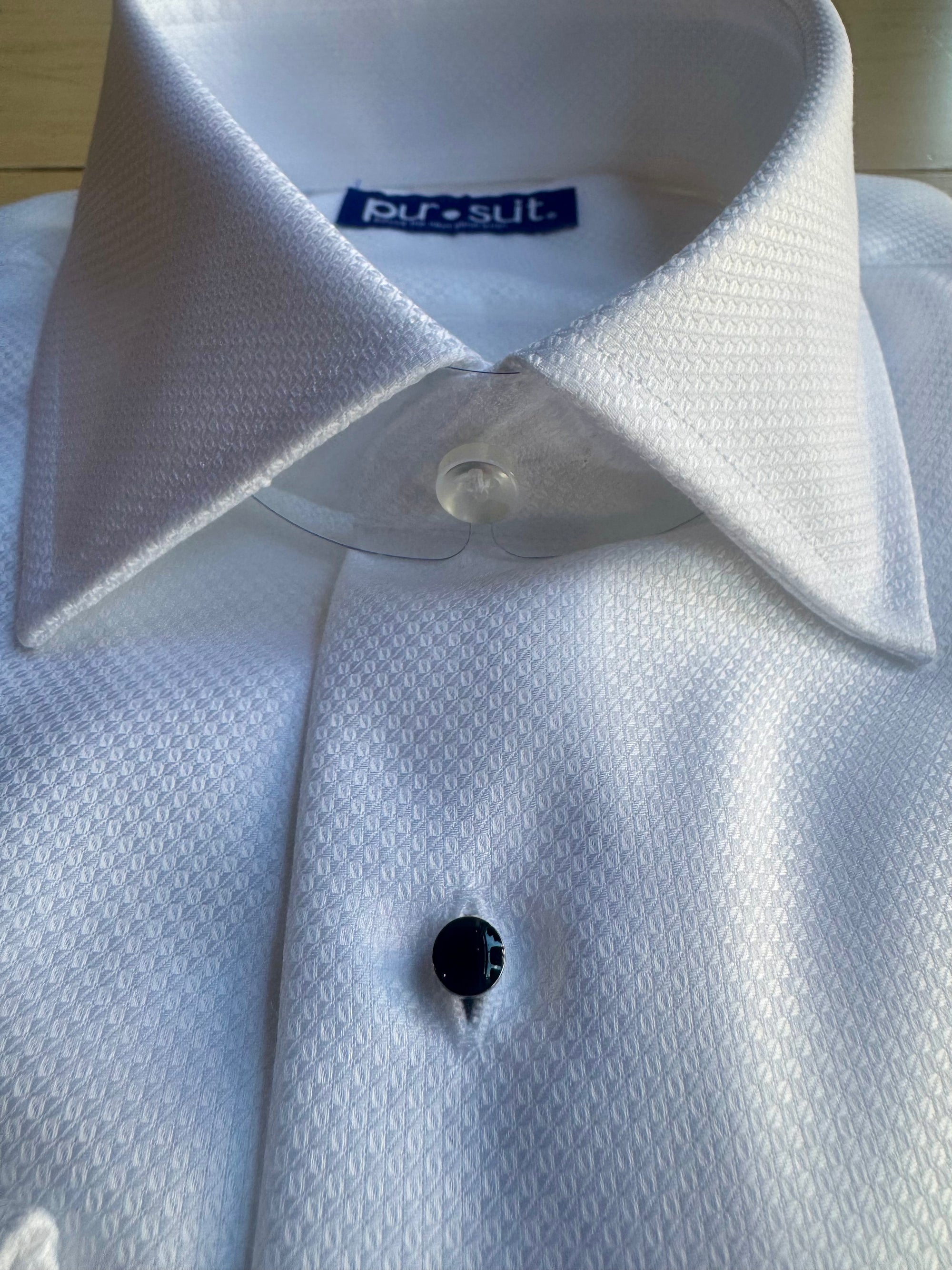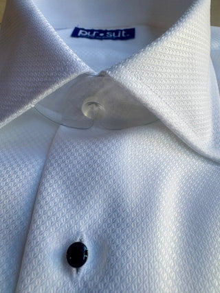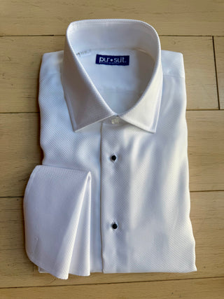 Classic white shirt with a dobby weave that provides texture. Wrinkle treated for low maintenance. Comes with black studs and a French cuff for your formalwear occasions.